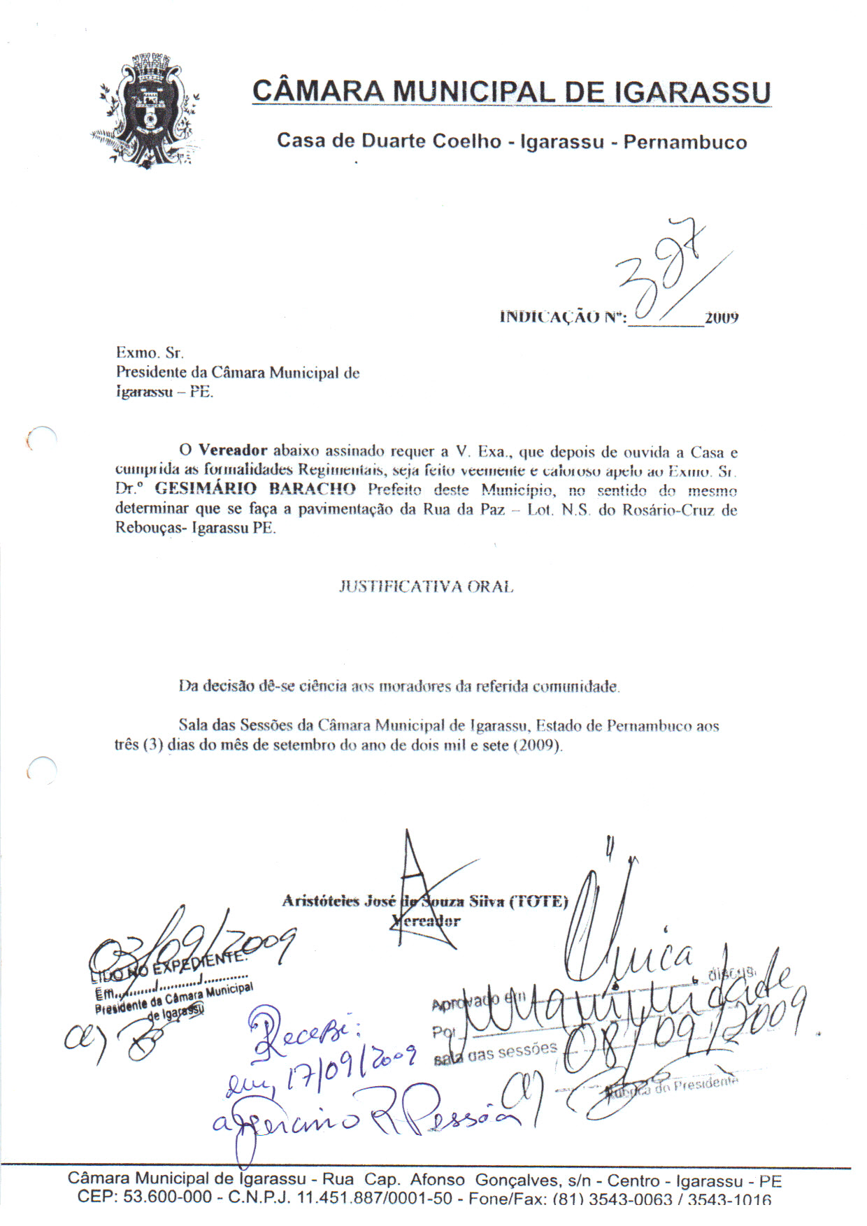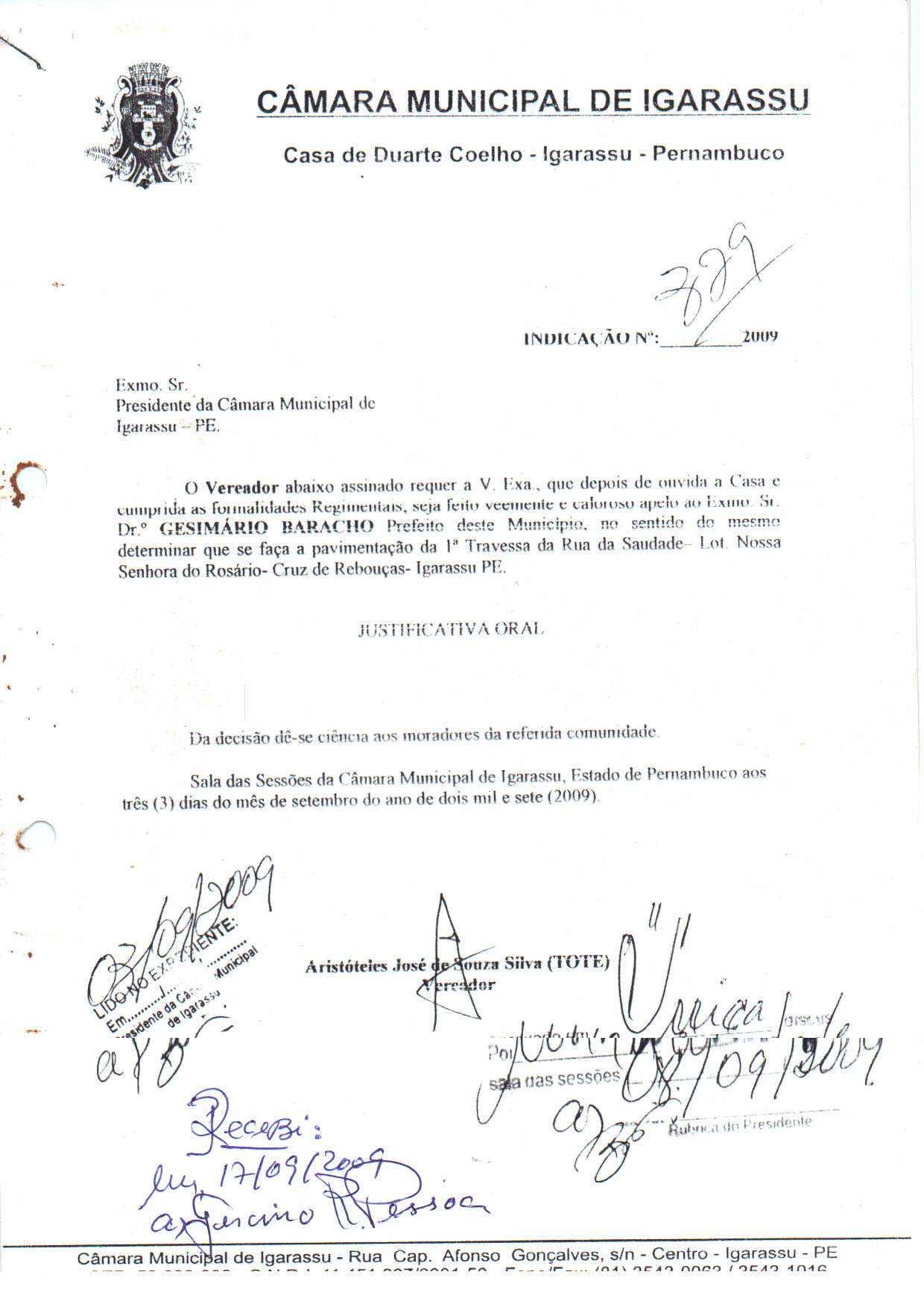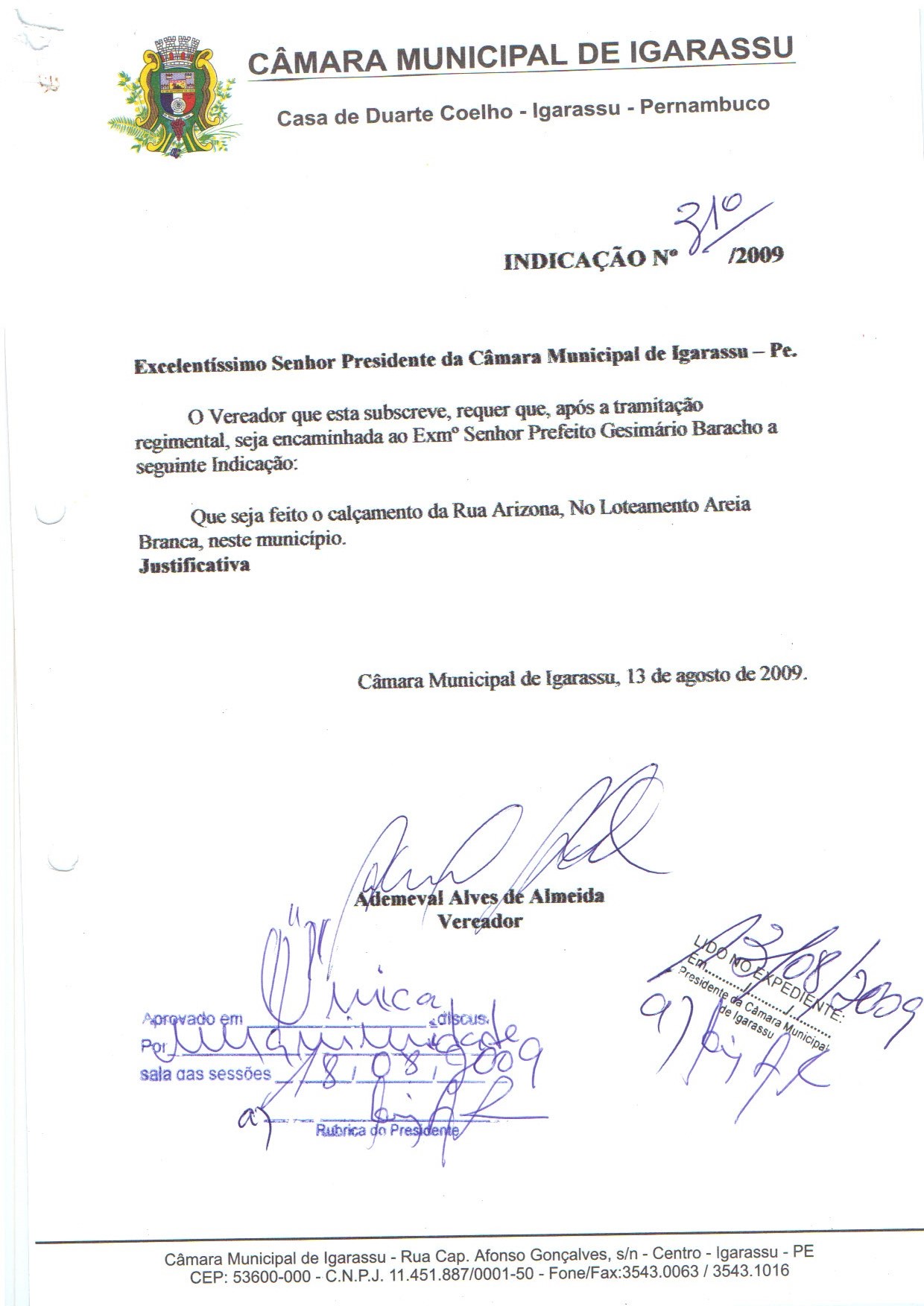 Ementa: REQUER QUE SEJA FEITO VEEMENTE APELO AO SR. PREFEITO DE IGARASSU, DR. GESIMARIO BARACHO, NO SENTIDO DE QUE O MESMO COBRE DA EMPRESA RESPONSÁVEL PELA LIMPEZA URBANA DA CIDADE DE IGARASSU, A CAPINAÇÃO, A RETIRADA DO LIXO, A LIMPEZA DE CANALETAS BEM COMO DA SECRETARIA DE OBRAS A REPOSIÇÃO DO CALÇAMENTO EM ESPECIAL AS LINHAS DE ÁGUA DA COMUNIDADE DA VILA DA FACHESF. COM ISSO ATENDEREMOS PARTE DA NECESSIDADE DAQUELA COMUNIDADE.