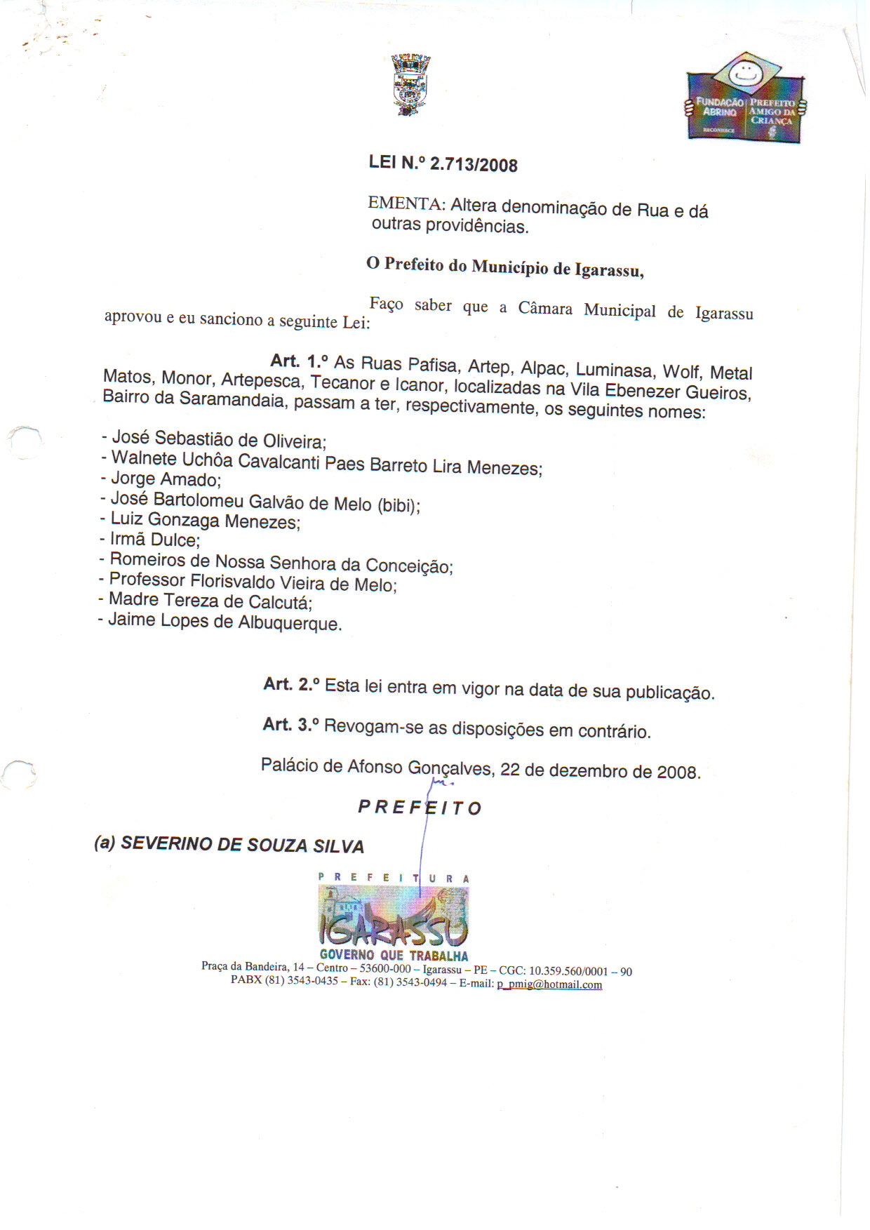 Lei nº 2.713, de 22 de dezembro de 2008